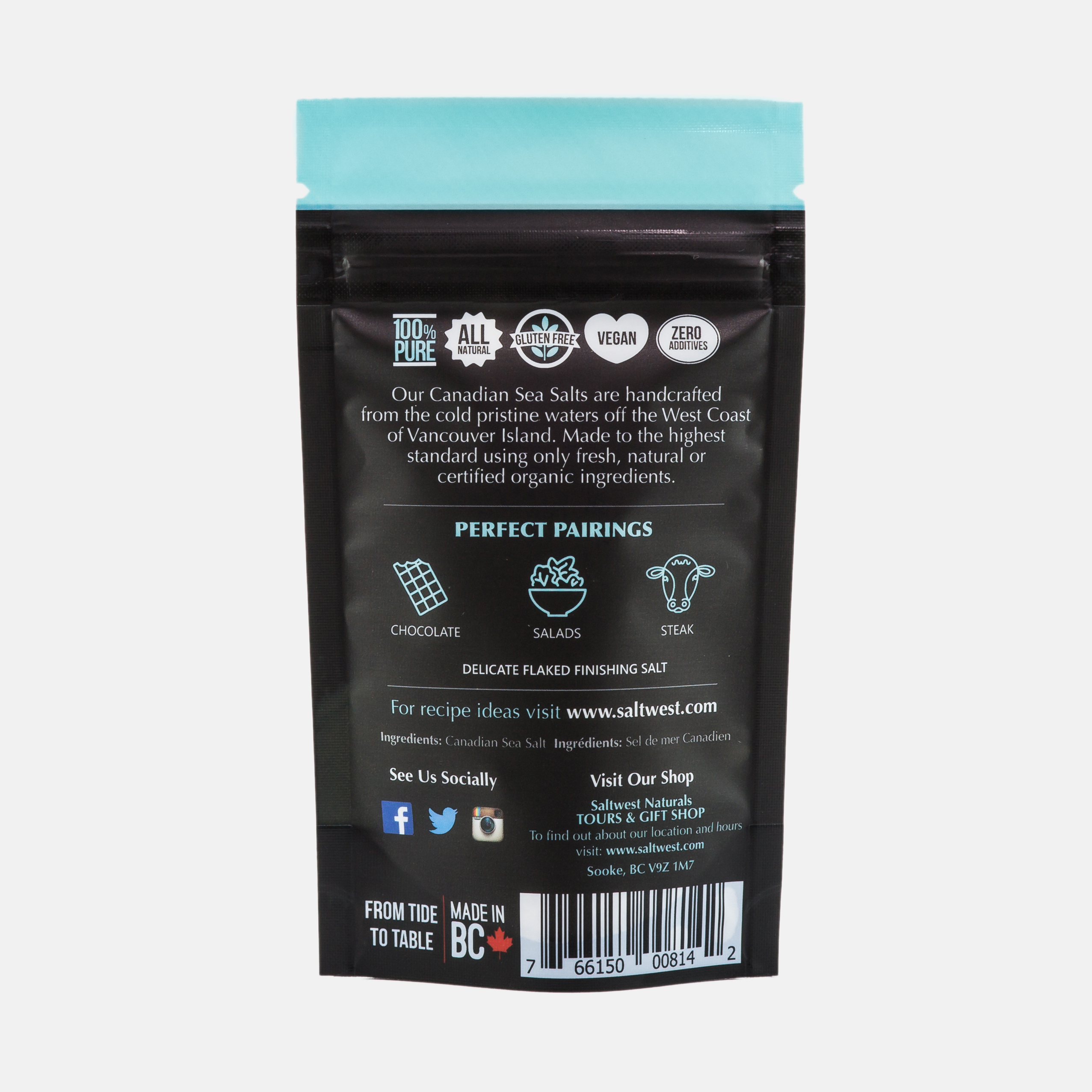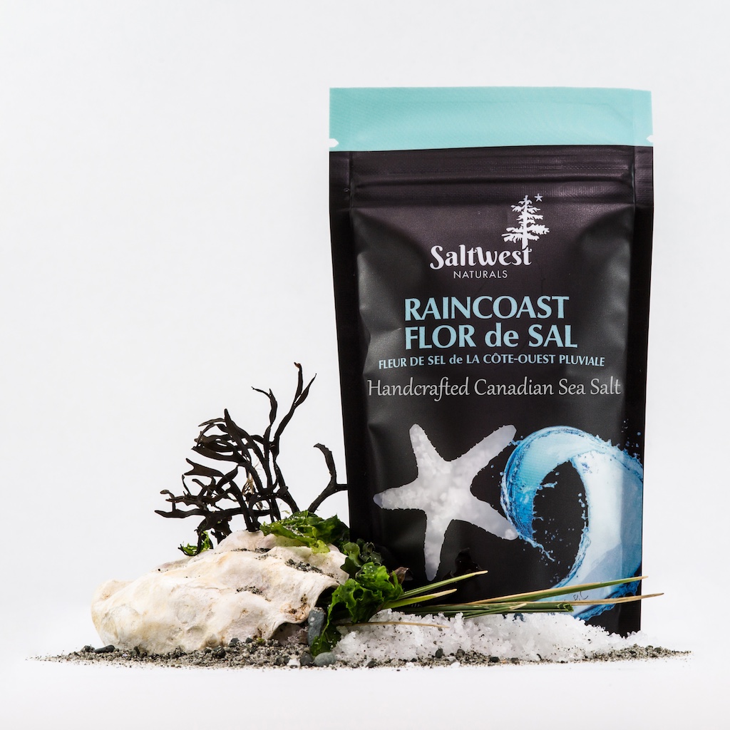 Our Raincoast Flor de Sal is handcrafted from the cold pristine waters off the West Coast of Vancouver Island. This sea salt is carefully hand-harvested from the mother brine in small batches to produce a delicate flake with a balanced pure flavour. All-natural and free from anti-caking chemicals. Replace your everyday salt with a healthy option to season any dish.