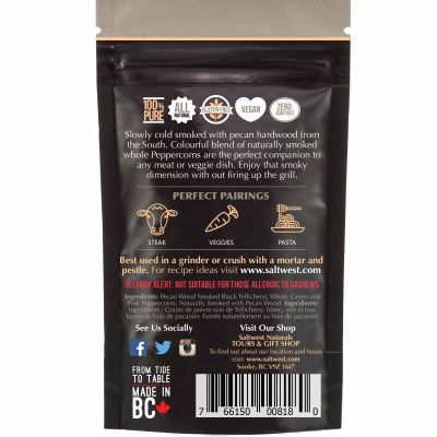 Slowly cold smoked with pecan hardwood from the South. Colourful blend of naturally smoked whole Peppercorns is the perfect companion to any meat or veggie dish. Enjoy that smoky dimension without firing up the grill. Try this on your corn on the cob or to season alfredo pasta!