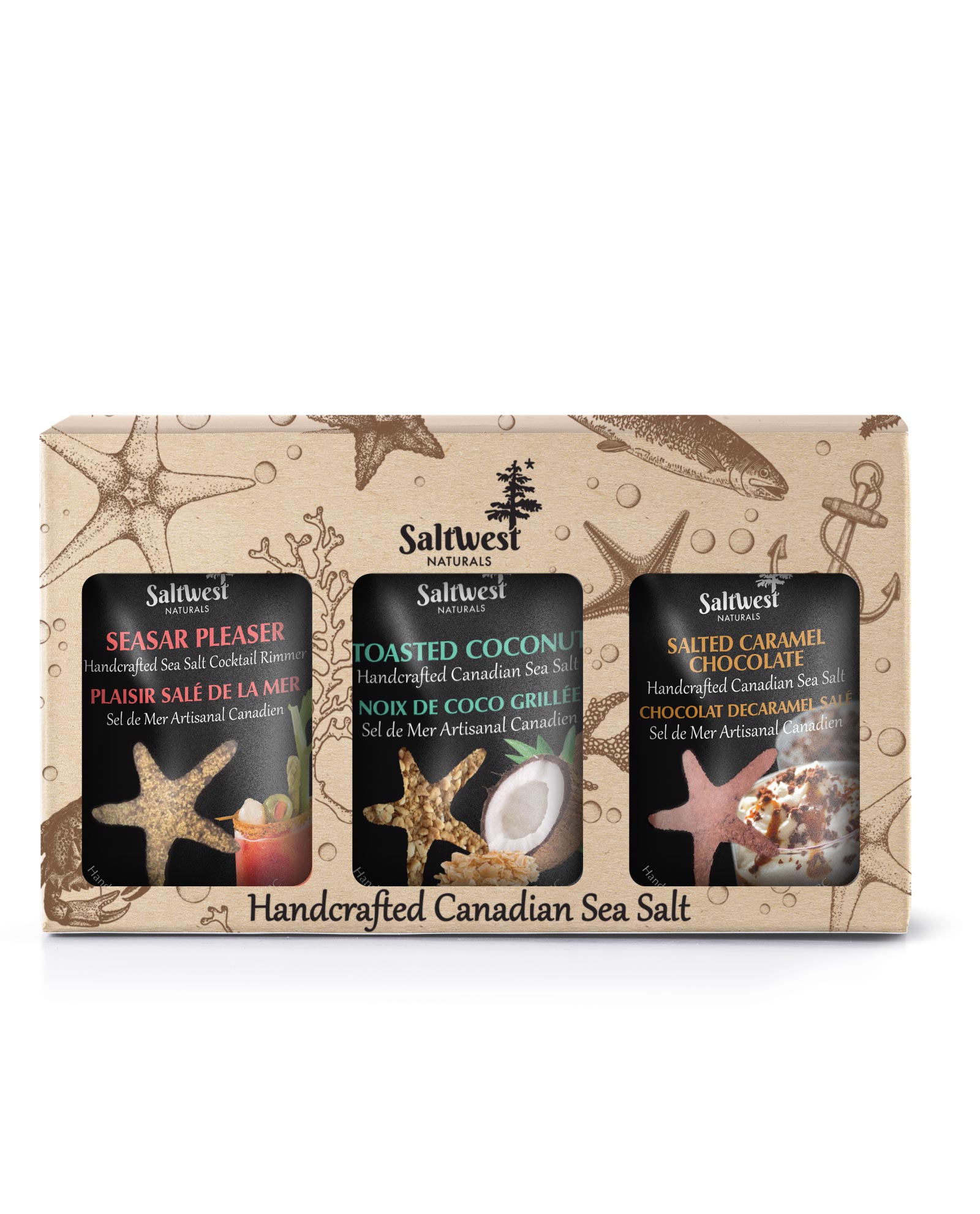 NEW! Updated selection with Dill Pickle in place of Flor de Sal - West Coast inspired Culinary Gift Box is a great gift for that special someone in your life. Cocktail Rimmer Set includes our Saltwest Seasar Pleaser Rimmer, Dill Pickle & Salted Caramel Chocolate.